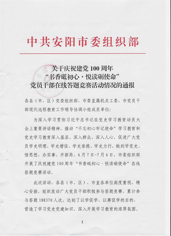 2021年6月7日——7月6日,按照中共安陽市委組織部《關(guān)于開展慶祝建黨100周年“書香砥初心·悅讀礪使命”黨員干部在線答題競賽活動的通知》要求,公司各黨支部積極組織黨員、預(yù)備黨員、入黨積極分子關(guān)注“安陽黨建”微信公眾號,踴躍參與線上答題活動。