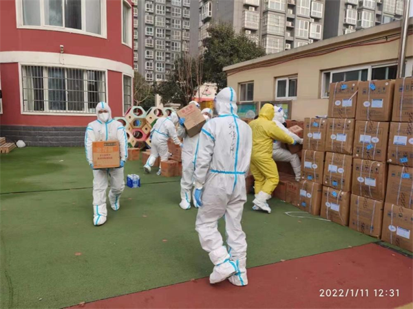這次疫情發(fā)生之初,和園一期屬于封控區(qū),1月11日,為保障封控小區(qū)群眾的正常生活,特保大隊15名隊員在銀杏大街派出所所長薛玉良帶領(lǐng)下?lián)斖粨絷?,將千余套生活物資挨家挨戶送到和園一期小區(qū)居民家中。