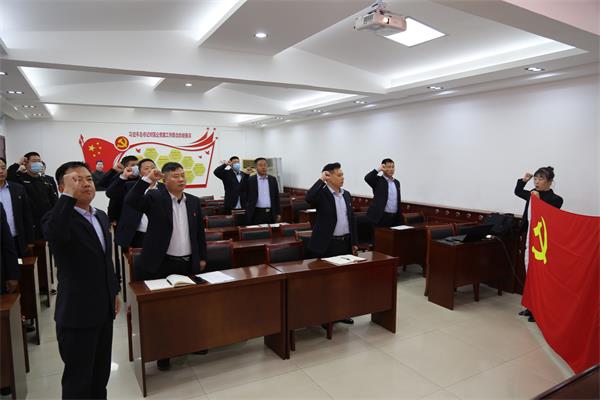 重溫入黨誓詞,回憶入黨初心?!拔抑驹讣尤胫袊伯a(chǎn)黨,擁護黨的綱領,遵守黨的章程,履行黨員義務,執(zhí)行黨的決定……”面對鮮紅的黨旗,孫國濤帶領全體黨員高舉右手,莊嚴宣誓,用堅毅的目光、洪亮的聲音,詮釋對黨的無限忠誠和為黨的事業(yè)奮斗終身的堅定信念。