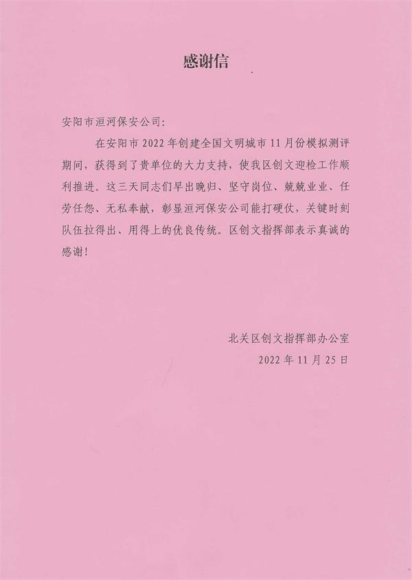 此次,志愿者們在服務(wù)中增強(qiáng)了社會責(zé)任感,以實(shí)際行動圓滿完成了我市文明城市創(chuàng)建任務(wù),同時北關(guān)區(qū)創(chuàng)文指揮部發(fā)來表揚(yáng)信,表揚(yáng)公司在安陽市創(chuàng)文模擬測評期間做出的貢獻(xiàn)。彰顯了洹河保安公司能打硬仗,關(guān)鍵時刻隊伍拉得出、用得上的優(yōu)良傳統(tǒng),展示了洹河保安公司作為新創(chuàng)省級文明單位的責(zé)任擔(dān)當(dāng)和奉獻(xiàn)精神。