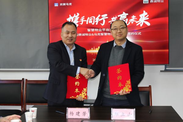 隨后,歡聚馬克創(chuàng)始人鄭立山與鼎誠物業(yè)經理楊建芳進行戰(zhàn)略合作簽約。
