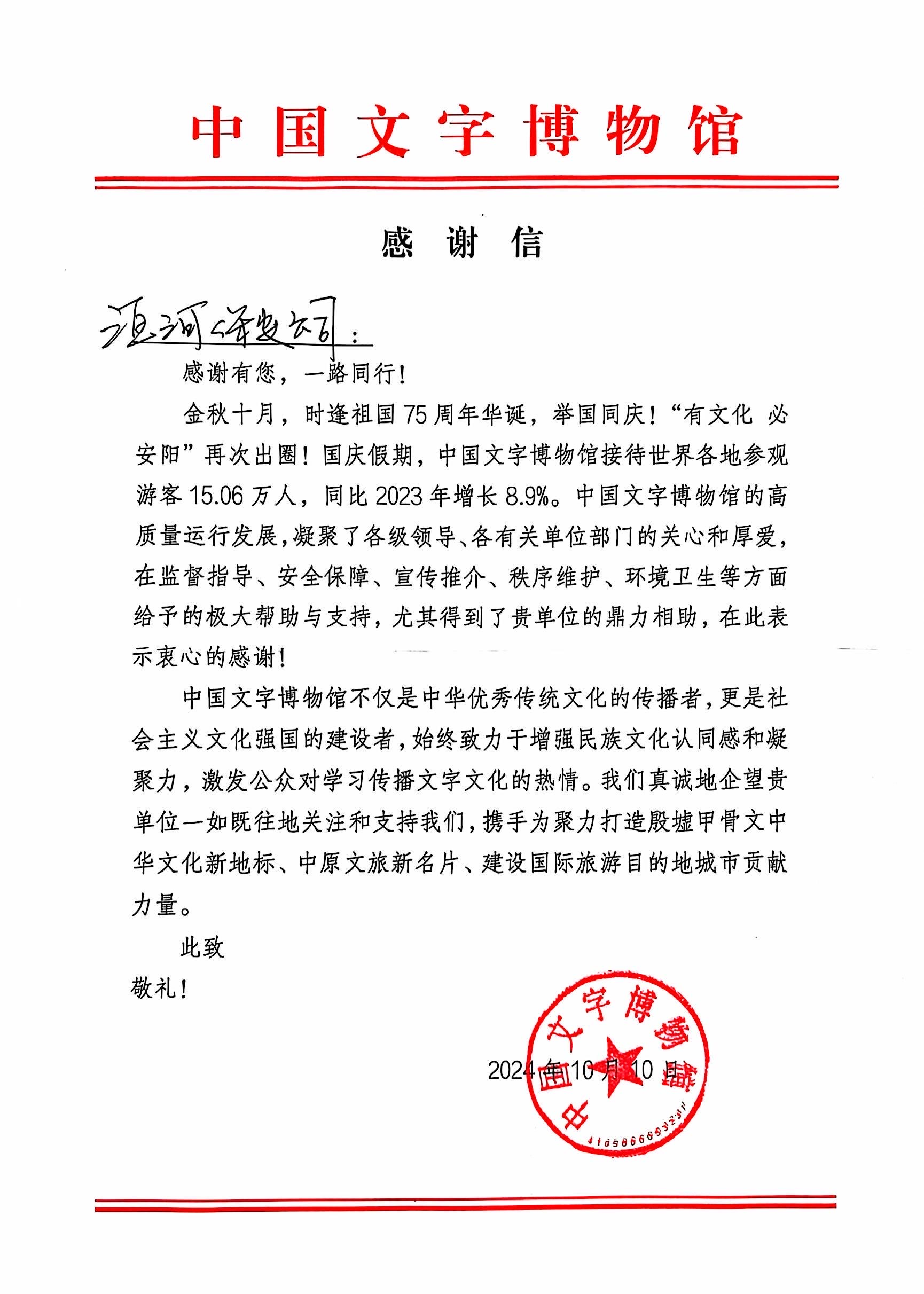 10月12日,中國文字博物館安全保衛(wèi)部主任孫琳杰專程來到我公司,送來一封感謝信,以此感謝今年國慶期間公司在安全保衛(wèi)工作中所付出的努力和作出的貢獻。此次國慶期間,中國文字博物館接待世界各地參觀游客15.06萬人次,參觀人數(shù)多、時間長、影響面廣,公司全體保安員盡職盡責,嚴格落實各項安保措施,以飽滿的熱情和敬業(yè)的工作態(tài)度,為博物館安全作出了積極貢獻。