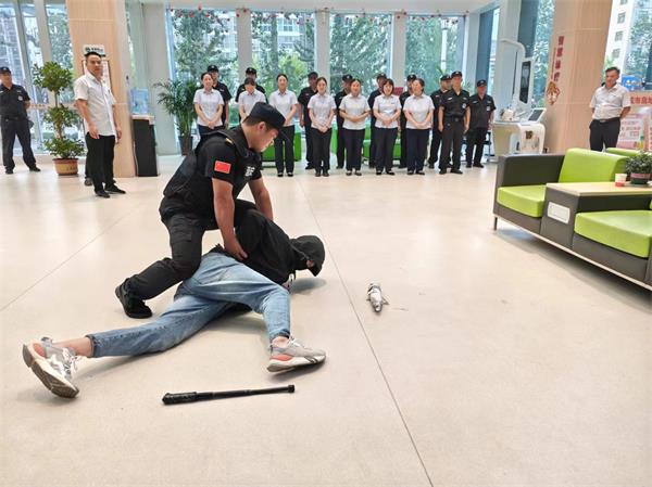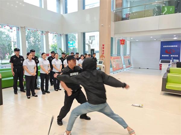 緊接著,模擬場景二上演。一名“歹徒”趁儲戶正在柜臺存錢時,突然亮出兇器實施搶劫。大廳保安第一時間啟動應(yīng)急預案,手持防暴器械迅速沖向“歹徒”,以敏捷的身手和勇敢的行動對“歹徒”進行圍堵和控制。大堂經(jīng)理則立即按下報警按鈕,柜臺工作人員沉著冷靜,在保障自身安全的前提下,迅速將現(xiàn)金收入保險柜并隱蔽。在保安人員的緊密協(xié)作下,“歹徒”很快被制服,等待警方到來進一步處理。