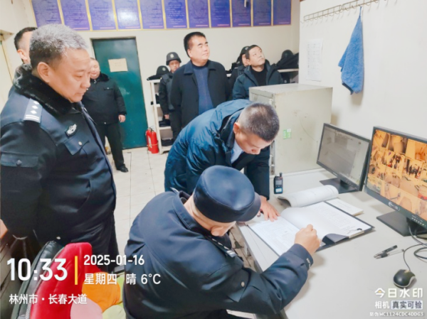 1月16日上午,安陽市公安局治安支隊民警郭慶林一行在守押分公司副經理韋洪東陪同下,到守押七大隊檢查工作,大隊長楊中朝全程陪同。