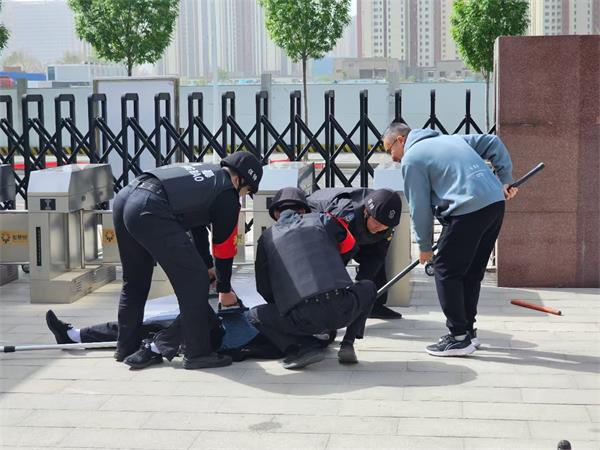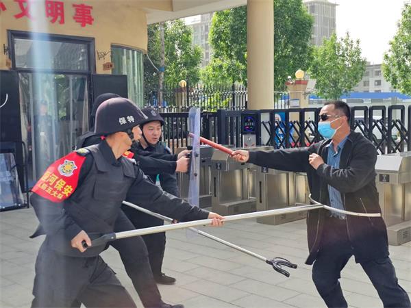 按照應(yīng)急預(yù)案,當(dāng)班的3名保安迅速分工。一人持防暴盾牌正面封堵“歹徒”前進(jìn)路線,兩人持鋼叉從側(cè)后方包抄。面對“歹徒”的揮砍威脅,保安團(tuán)隊(duì)采用“盾牌交叉防御+鋼叉鎖喉控制”戰(zhàn)術(shù),逐步壓縮其活動空間。在與“歹徒”周旋的2分鐘內(nèi),最終協(xié)同將“歹徒”制服。此時(shí)園區(qū)已完成師生避險(xiǎn)疏散,警方支援力量也同步抵達(dá)現(xiàn)場。