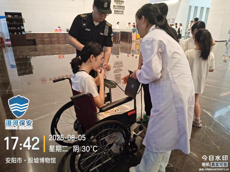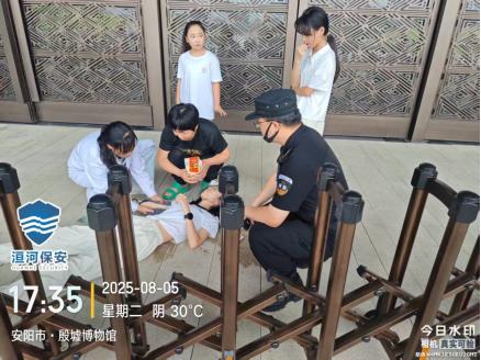 8月5日17時(shí)35分,殷墟博物館南門檢票區(qū),特保隊(duì)員李昊巡邏時(shí),發(fā)現(xiàn)一名女游客突發(fā)暈厥。隨即上前穩(wěn)定游客身體姿態(tài),詢問同行的郭女士得知,暈倒者為其女兒,因高溫在等待檢票過程中突發(fā)身體不適繼而暈厥。