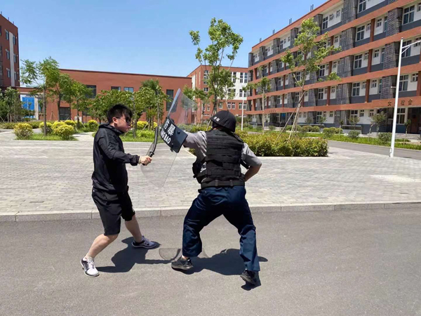 此次演練背景設(shè)置為:在安定祥和的氣氛中,保安正在門崗執(zhí)勤。9時(shí)30分許,一男子來(lái)到校門口,要求進(jìn)入學(xué)校。保安在問(wèn)其緣由后,依照規(guī)定拒絕其入內(nèi)。就在這時(shí),該男子突然強(qiáng)行闖崗。保安見(jiàn)狀,疾步擋在男子前面,男子用棍棒向保安襲來(lái),保安手持盾牌抵擋。男子見(jiàn)無(wú)法傷到保安,轉(zhuǎn)身沖向院內(nèi)的教學(xué)樓。保安沖到男子面前,用鋼叉將其牢牢控制住,在同事的幫助下迅速合力將“歹徒”制伏。