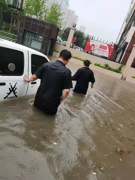 關鍵時刻,沙袋用完,大雨沒有絲毫停止的預兆,怎么辦?李艷軍和中原銀行領導商定:從綠化帶挖土。當機立斷,帶領大隊人馬冒著大雨倘著水去裝土,一趟一趟,一袋一袋背回去,跌倒、滑倒立刻爬起來,和時間賽跑,少一秒就意味著險情的增大;由于洪水過大,污水井蓋被沖開,在搶險中,方志林、趙勇掉入井中,及時被救了上來,所幸沒有造成人員傷亡。沒人怕累,怕臟,雖然每個人都身心疲憊,但臉上都充滿著斗志。