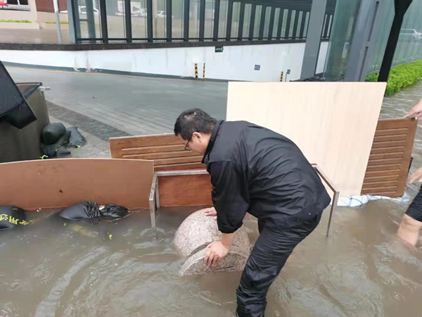 負一層這時候水已經淹到了膝蓋處;由于配電室被淹導致停電,李艷軍大隊長馬上摸黑帶領隊員裝沙袋,找擋板,蹚著近腰高的深水堵截洪水。背沙袋、拖沙袋、拉沙袋,隊員們一路小跑,不管用什么辦法,爭分奪秒,搶險第一,戰(zhàn)勝洪水。