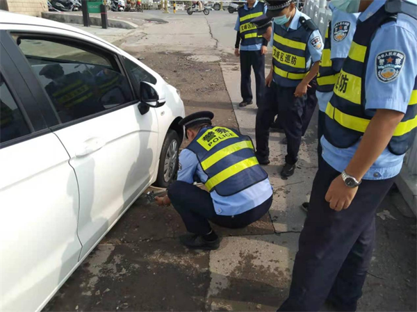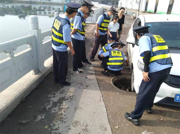 7月24日上午9時許,隊員楊科、李思聰、石玉濤等人,巡邏至文峰路西營街交叉口時,發(fā)現(xiàn)一輛白色轎車的右前輪陷在窨井里,趕忙上前查看情況,應(yīng)是前幾日暴雨把窨井蓋給沖走了,導(dǎo)致車輛右輪卡在了窨井口。隨后,隊員們有的協(xié)助車主張女士,使用千斤頂把車輛頂起,有的在附近尋找被雨水沖走的窨井蓋。隊員們把找到井蓋放回原位,幫助車主安全離開,車主張女士一再表示感謝。