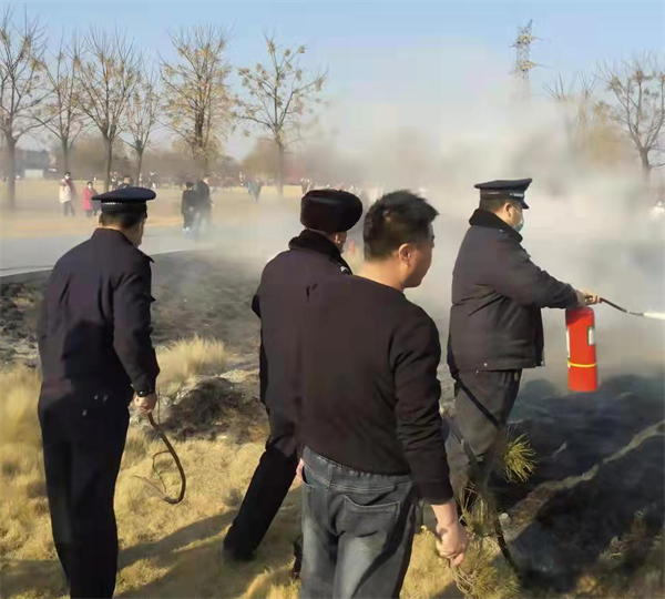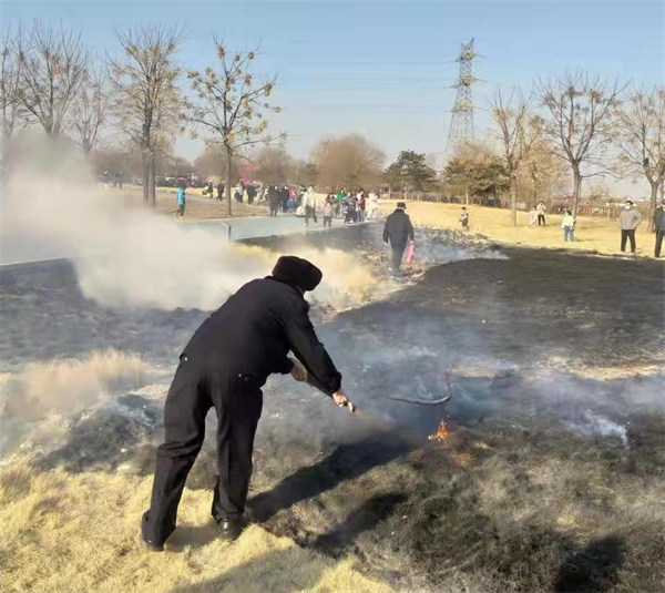2月19日下午4點(diǎn),人防四大隊(duì)殷都區(qū)文廣新局保安班長(zhǎng)王俊峰和隊(duì)員郝彥軍像往常一樣,按照規(guī)定的線路執(zhí)行安保巡邏,當(dāng)他們?cè)谝笮骈T(mén)口巡邏執(zhí)勤時(shí),發(fā)現(xiàn)殷墟廣場(chǎng)前草坪上冒起濃濃黑煙,有火險(xiǎn),他們隨即趕到火險(xiǎn)現(xiàn)場(chǎng),班長(zhǎng)王俊峰和郝彥軍隨手撿起地上的木棍進(jìn)行滅火,王俊峰通知郝彥軍趕快上報(bào)殷墟警務(wù)室,殷墟警務(wù)室王隊(duì)長(zhǎng)得知后,立即帶領(lǐng)警務(wù)室所有隊(duì)員拿著滅火器趕到現(xiàn)場(chǎng)進(jìn)行滅火。由于發(fā)現(xiàn)及時(shí),在大家的共同努力下,將草坪上的明火撲滅。