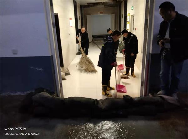4月6日晚上十一點(diǎn),人防一大隊(duì)駐聯(lián)通公司東區(qū)崗點(diǎn)中、夜班的隊(duì)員交接完工作之后,夜班值班隊(duì)員杜懷濤、孟慶春開(kāi)始接班后的正常巡樓工作。當(dāng)他們巡邏到負(fù)二層時(shí),聽(tīng)到有水流的聲音,職業(yè)的敏感提醒他們,有管道跑水,順著流水的聲音巡去,果不其然,負(fù)二層中央空調(diào)系統(tǒng)供水管道破裂,管道里的水不停向外噴射,如果不及時(shí)處置,會(huì)引發(fā)負(fù)二層注水,給客戶造成財(cái)產(chǎn)損失。兩位值班隊(duì)員馬上通知監(jiān)控中心和值班班長(zhǎng),值班班長(zhǎng)邱文濤接到報(bào)警后迅速向中隊(duì)長(zhǎng)董紅衛(wèi)匯報(bào)情況,同時(shí)安排夜班同志到現(xiàn)場(chǎng)處理積水,董紅衛(wèi)趕赴現(xiàn)場(chǎng)后和值班隊(duì)員一起配合專業(yè)的維修人員處置險(xiǎn)情,經(jīng)過(guò)近五個(gè)小時(shí)的奮戰(zhàn),險(xiǎn)情得到妥善解決。