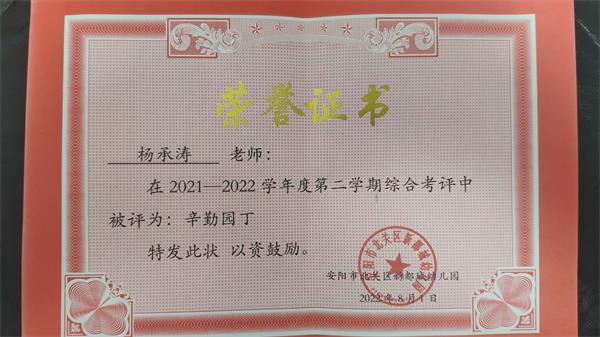 在新都城幼兒園授予該同志的榮譽(yù)證書上這樣寫道:楊承濤老師在2011--2022學(xué)年度第二學(xué)期綜合考評中被評為:辛勤園丁。在以往校園安保工作中,派駐的保安員受到客戶表彰者屢見不鮮,但不外乎“安全衛(wèi)士”“抗疫標(biāo)兵”等褒獎,被以“老師”“園丁”冠名的卻不多見。這充分說明該幼兒園已經(jīng)把楊承濤當(dāng)成內(nèi)部一名教職工看待,平時(shí)師生們都會以“楊老師”相稱。