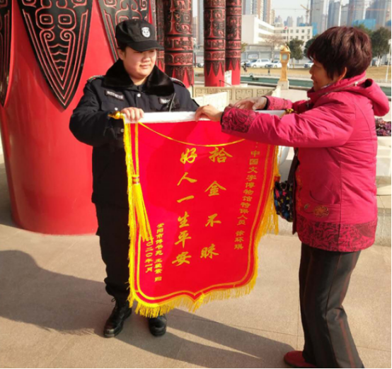“感謝特保隊員,你們的品德太高尚了,你們讓我相信了還是好人多。”2020年1月1日,家住博書苑的王愛素女士一看到特保大隊派駐在中國文字博物館的隊員徐環(huán)琪,便激動地說出這番話,并將一面寫有“好人一生平安,拾金不昧”的錦旗,送到徐環(huán)琪手中。這是怎么一回事呢?