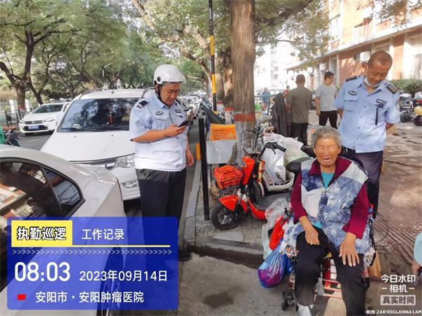 當(dāng)天早上8時許,駐北關(guān)區(qū)巡防隊員高亮、王曌執(zhí)行路面治安防控任務(wù),當(dāng)巡邏至洹濱北路腫瘤醫(yī)院門口時,看見一老人向路人招手,但沒有人搭腔。于是,他們趕過去查看情況。經(jīng)詢問,得知老人走失找不到回家的路。詢問其家人電話,家是哪里的,老人也說不明白。于是王曌便報告了110,等110到現(xiàn)場說明情況,移交給了民警處理。