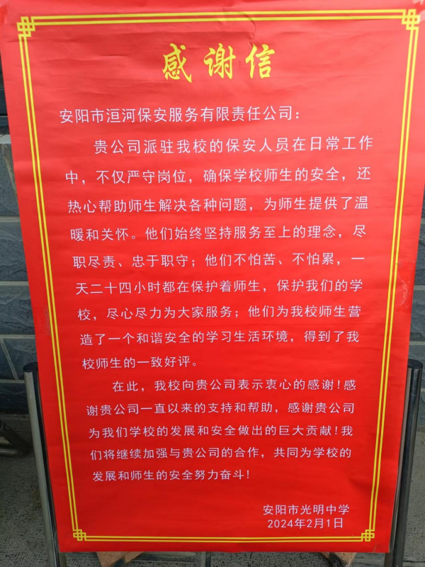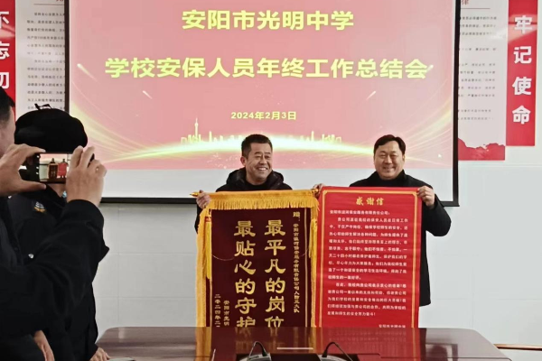 2024年2月3日,在安陽市光明中學(xué)年終工作總結(jié)會上,學(xué)校領(lǐng)導(dǎo)將一面印有“最平凡的崗位、最貼心的守護(hù)”的錦旗送到人防三大隊副大隊長劉慶剛手中,并致信表揚,感謝人防三大隊駐安陽市光明中學(xué)保安班對維護(hù)校園安全以及校園周邊治安秩序做出的積極努力和貢獻(xiàn)。