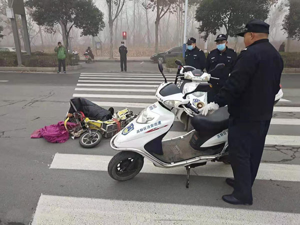 11月24日早上,人防一大隊(duì)駐高新區(qū)政法辦巡防隊(duì)隊(duì)員在轄區(qū)巡邏,救助一名交通事故受傷群眾。