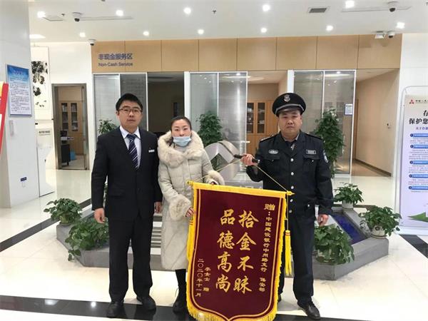 12月2日上午,李女士給中國建行中州路支行送來一面錦旗,激動地對行長說?!疤兄x你們了,如果不是建行保安大哥品德高尚,拾金不昧,我的損失就大了?!?