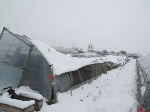 圖為蔬菜基地被積雪壓塌的大棚。