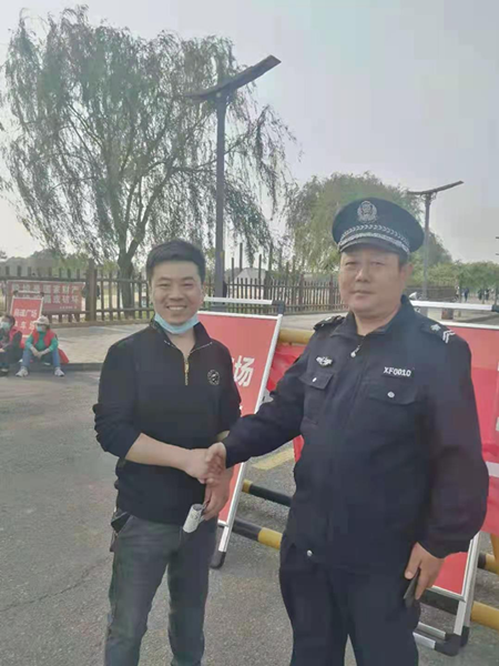 5月17日下午,安陽縣都里鄉(xiāng)好井村村民路鵬手持寫著“人民衛(wèi)士 盡職盡責(zé)”的錦旗趕到殷都區(qū)文廣新局文保巡防班,感謝巡防班班長王俊峰和隊(duì)員張文喜無私幫助其找回錢包的行為。