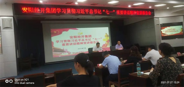 2021年7月27日下午,安陽市洹河保安公司黨委組織10名黨員干部,參加了由中共安陽經開集團黨委舉辦的學習貫徹習近平總書記“七一”重要講話精神宣講報告會,會議邀請河南護理職業(yè)學院馬克思主義學院副院長、副教授張艷林主講,會議由經開集團黨委書記、董事長齊方同志主持。