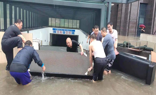 負一層這時候水已經淹到了膝蓋處;由于配電室被淹導致停電,李艷軍大隊長馬上摸黑帶領隊員裝沙袋,找擋板,蹚著近腰高的深水堵截洪水。背沙袋、拖沙袋、拉沙袋,隊員們一路小跑,不管用什么辦法,爭分奪秒,搶險第一,戰(zhàn)勝洪水。